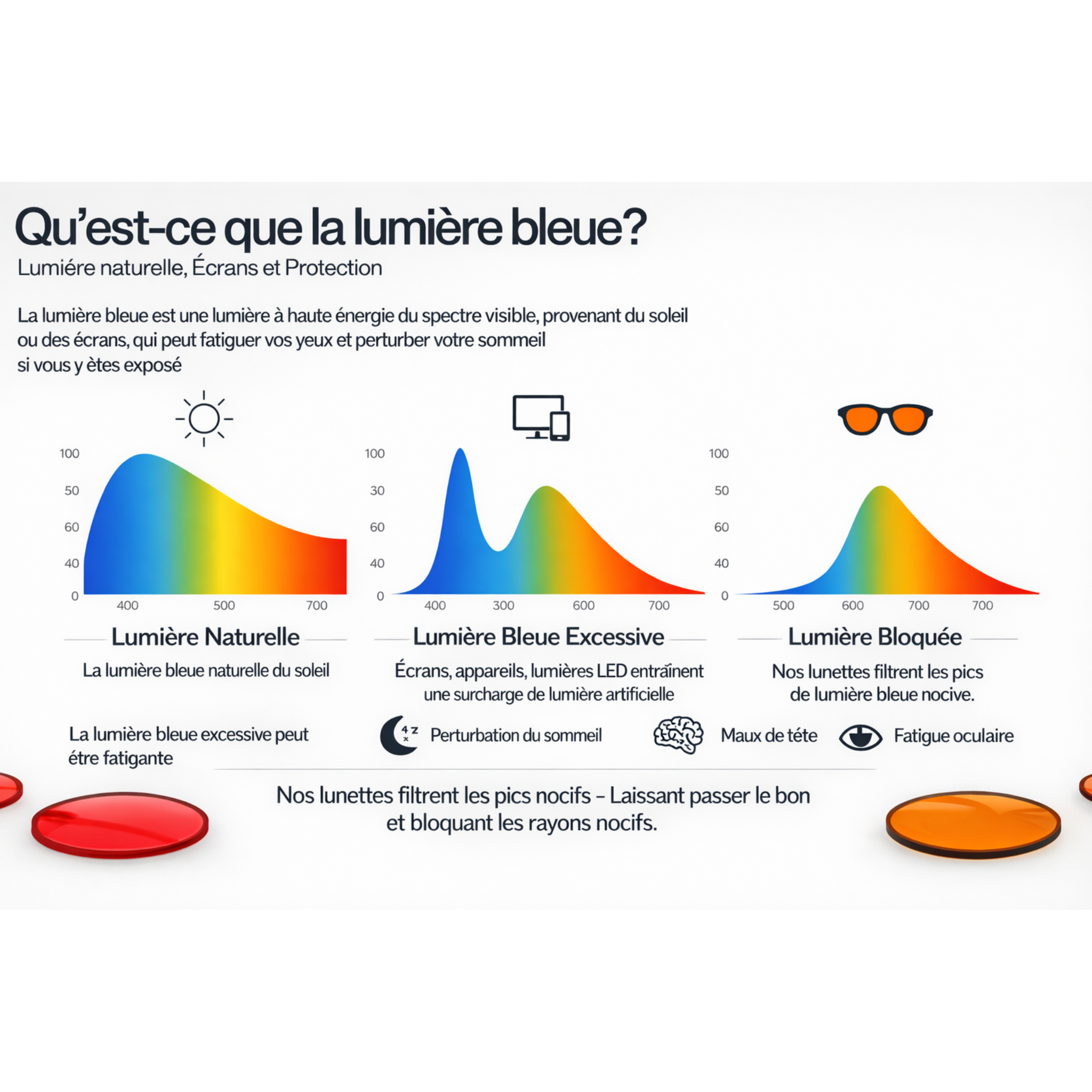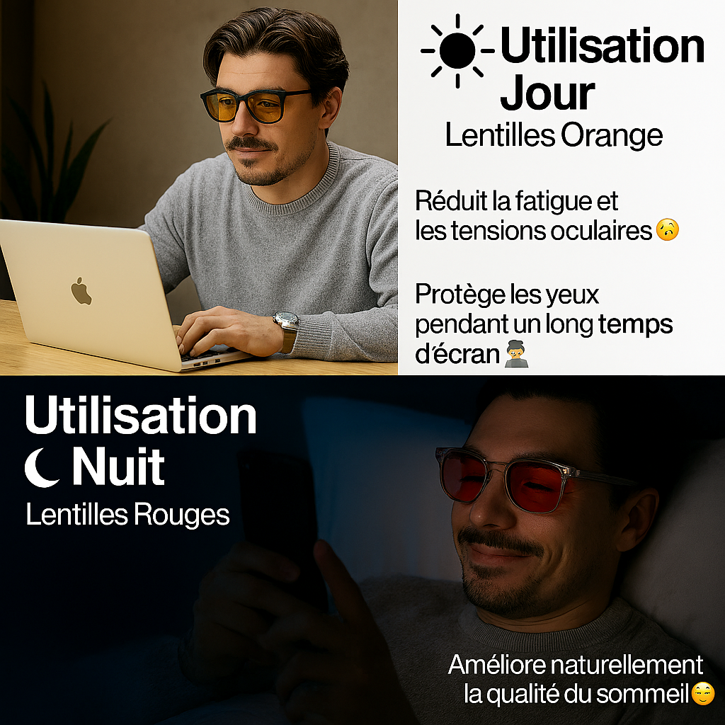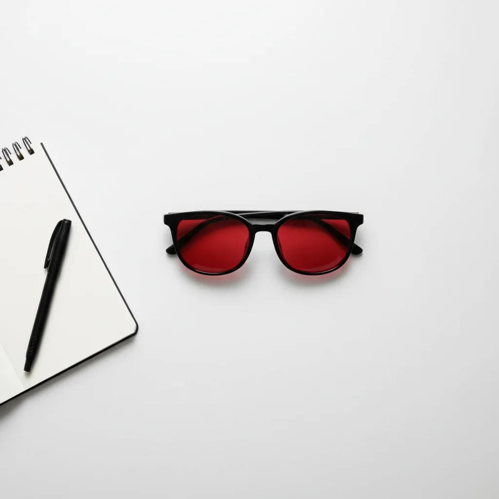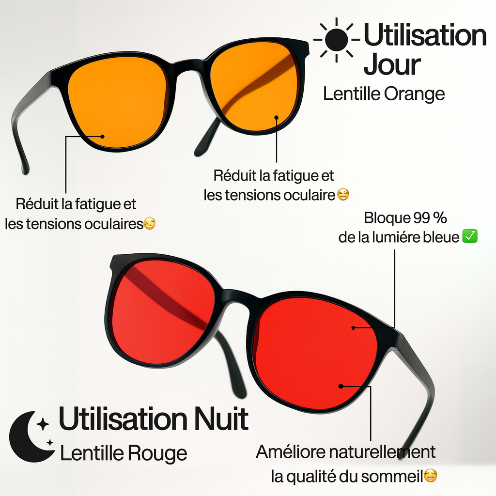 Nos verres rouges bloquent 100% de la lumière bleue et verte perturbatrice, offrant un bouclier optimal contre la fatigue oculaire et préparant votre esprit à une restauration profonde et ininterrompue.